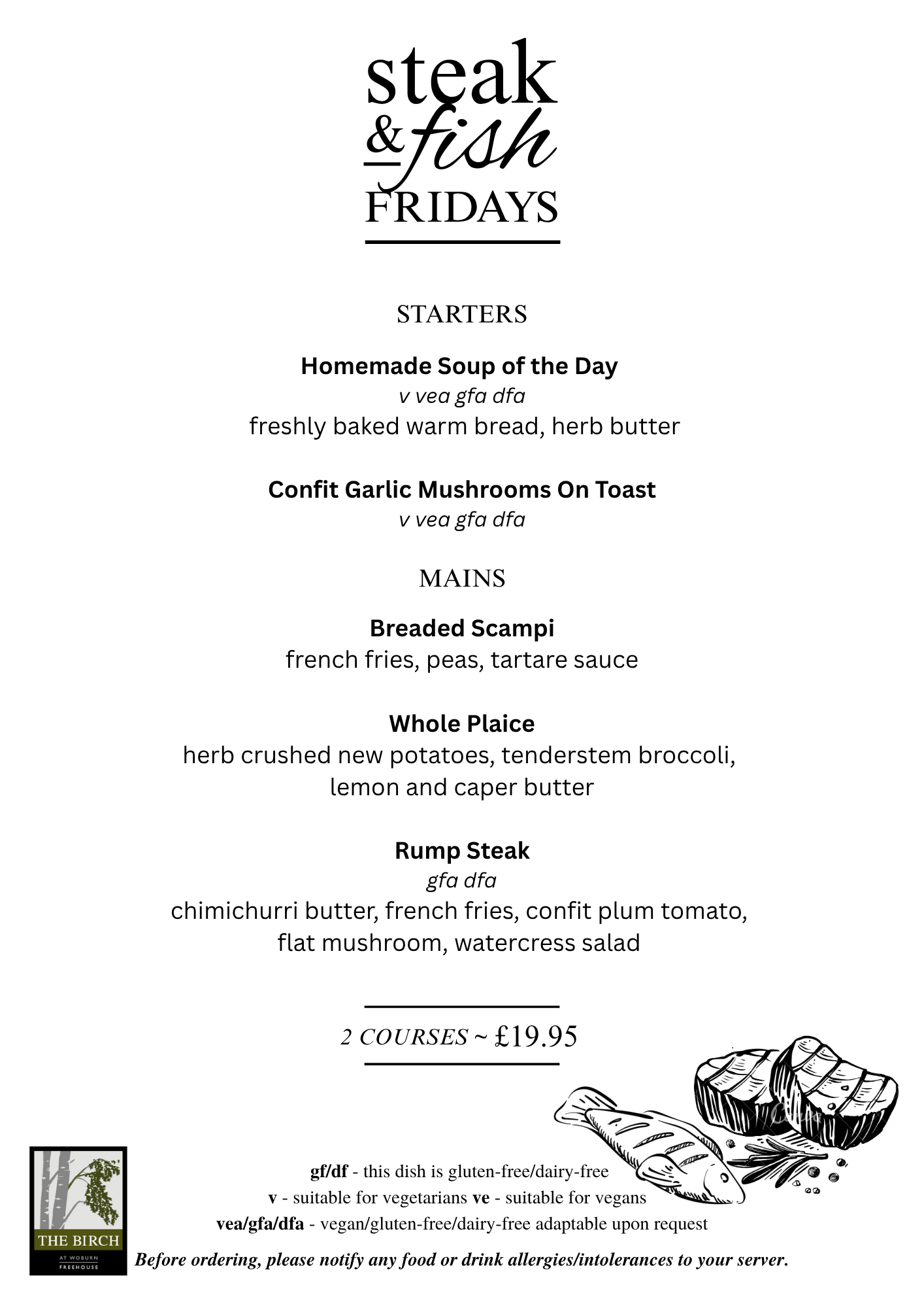 Dine at The Birch on a Friday and savour a succulent steak or dive into a delicious fish dish, available from our new special two-course menu — all for the incredible price of just £19.95!*